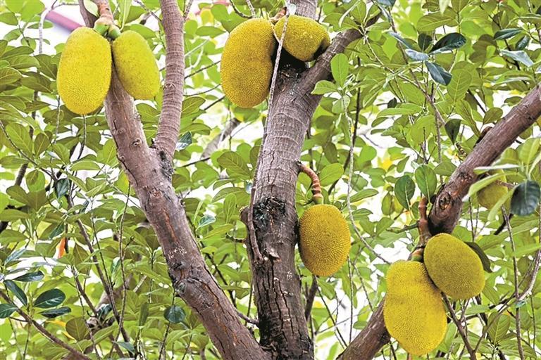 ▲罗湖区红宝路旁,大树上结出硕大菠萝蜜果。深圳晚报记者 陆颖 摄